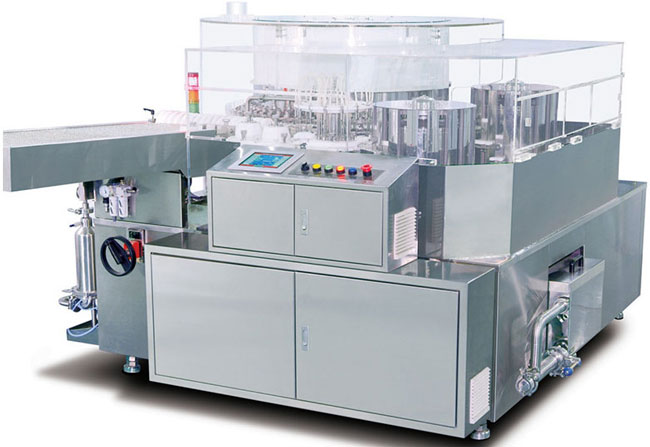 瓶子经注水后进入水槽进行超声波洗涤1分钟,然后由螺杆传送到提升拨轮,提升后由大转鼓机械手上夹住,通过机械手翻转180℃至瓶口朝下,依次进行水气交替清洗。清洗完毕后由机械手将瓶子翻正,通过出瓶拨轮将瓶子送出至灭菌烘箱。