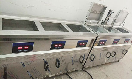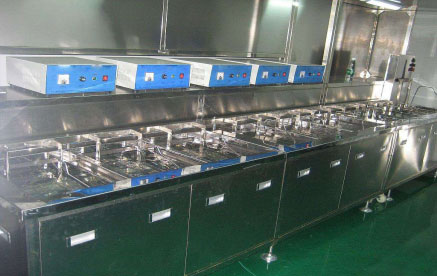 全自动超声波清洗机是专为清洗量大、清洗要求高、使用溶剂作为清洗介质的工件设计的专用清洗设备。设备生产主线一般有有1-2个超声波清洗槽、1-2个热水漂洗槽、1-2喷淋槽、1个烘干槽等工位组成,其工作原理是利用超声波渗透力强的机械振动冲击工件表面并结合清洗剂的化学除油、去污作用使工件表面洁净。